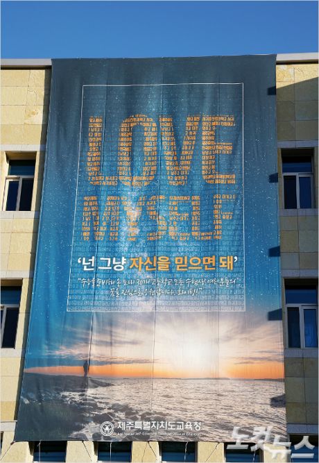 제주도교육청이 ‘2020학년도 대학수학능력시험’을 앞두고 수험생들을 응원하는 현수막을 본청 건물 외벽에 부착했다.(사진=제주도교육청 제공)