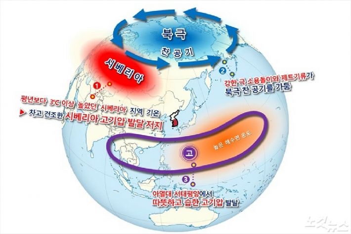 또 겨울철 북극 지역에 중심을 두고 발달해 찬 북극 공기를 머금음 저기압 덩어리인 ‘극 소용돌이’가 평년에 비해 강해 제트기류가 극 가까이에서 북극의 찬 공기를 가두는 역할을 했다고 설명했다.