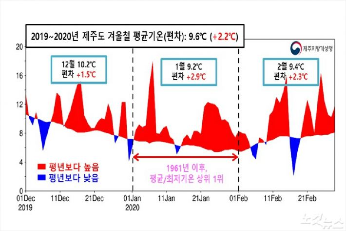 지난 겨울 제주도 평균기온은 9.6도로 1961년 이후 가장 높았고, 최고기온도 평년편차보다 1.9도 높은 12.6를 보였다. 최저기온은 6.8도로 평년편차보다 2.4도 높아, 이례적으로 가장 따뜻했다.